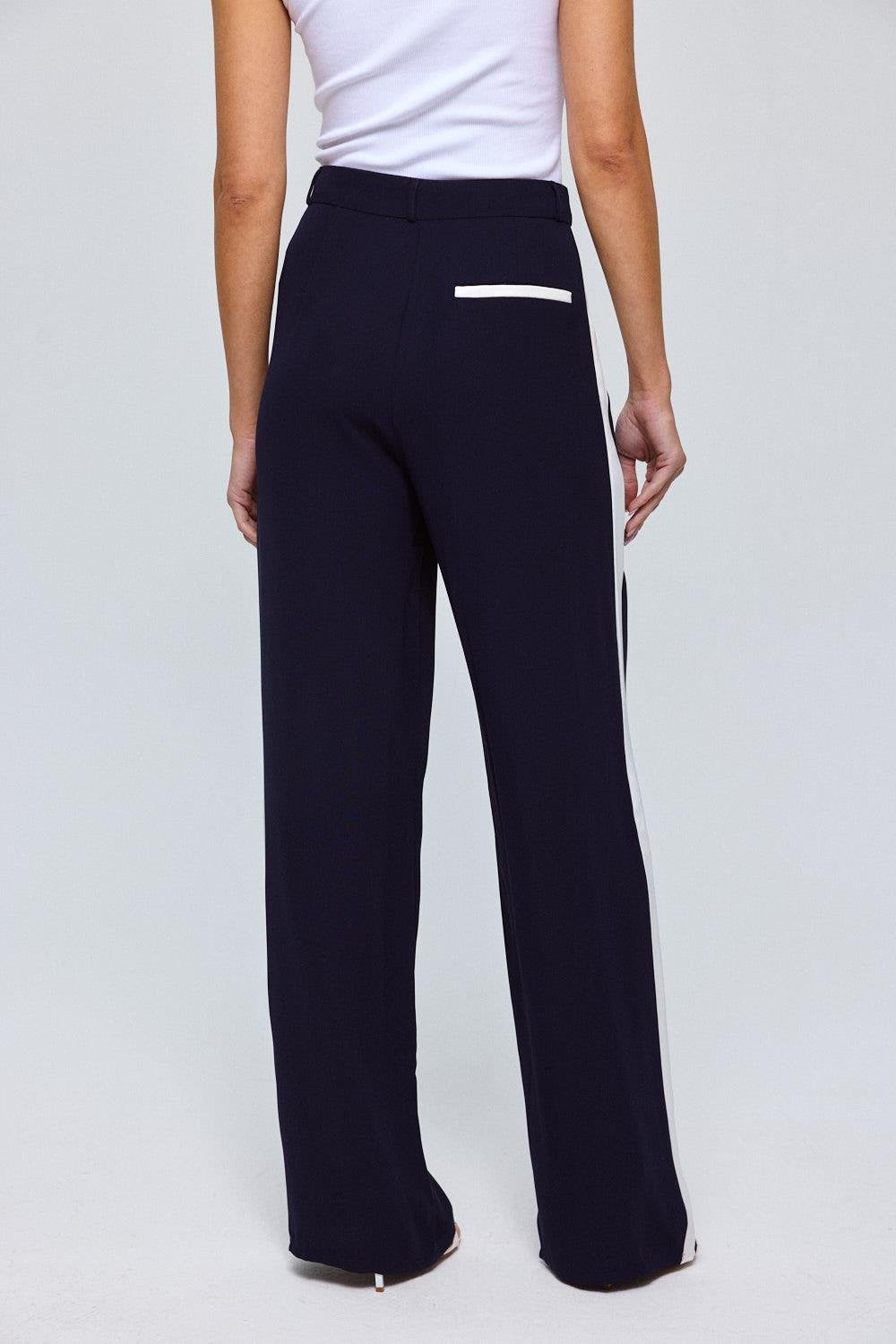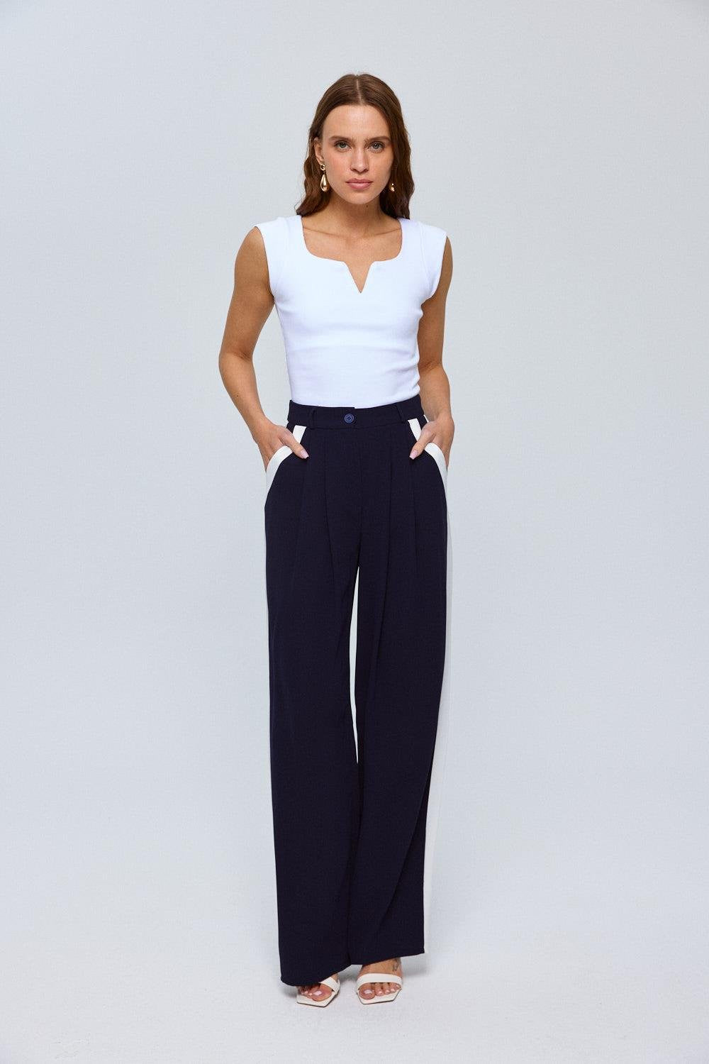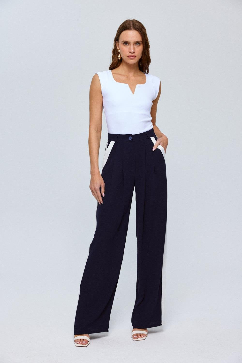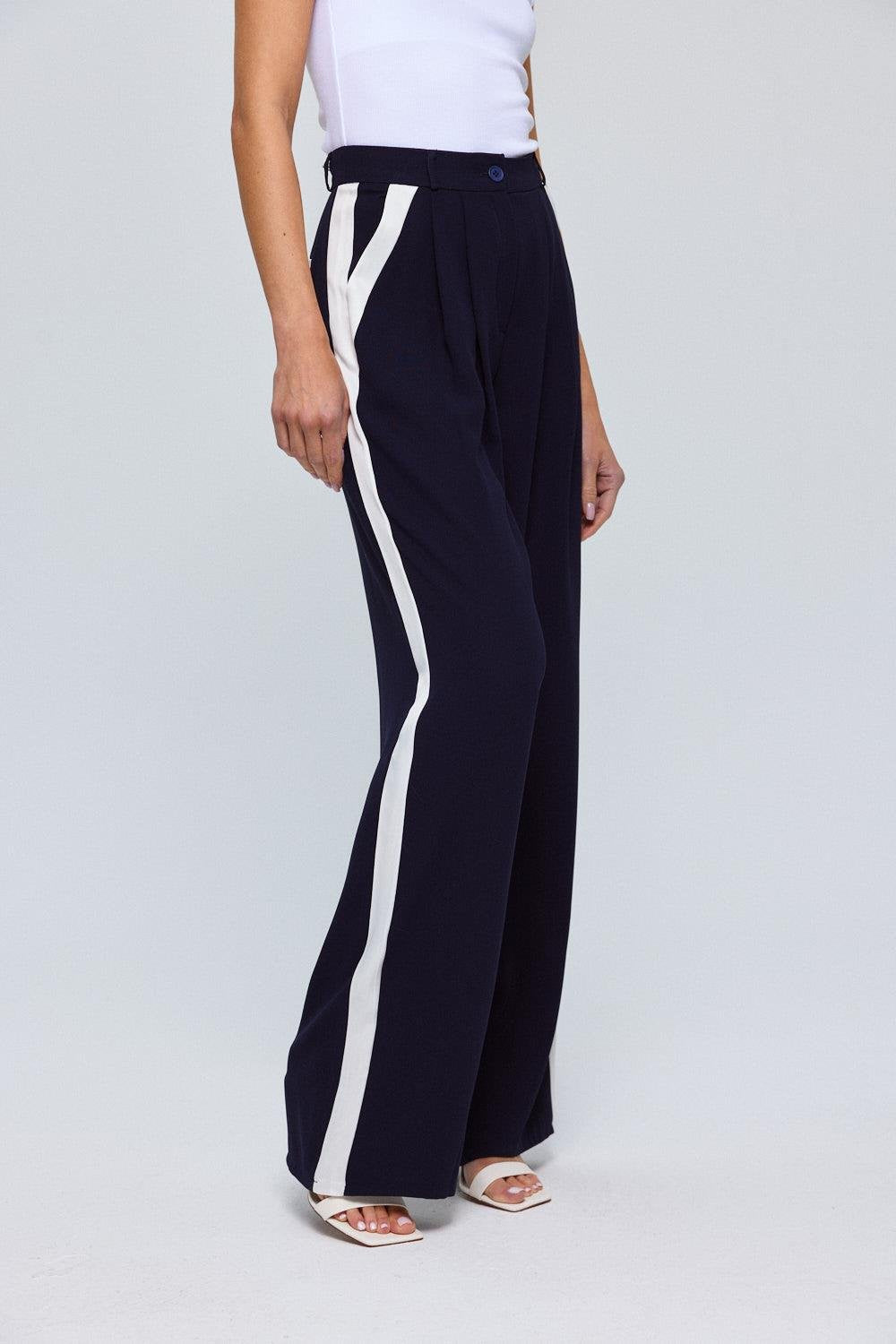 Navy Blue Button Up Trousers with Cream Side Stripe